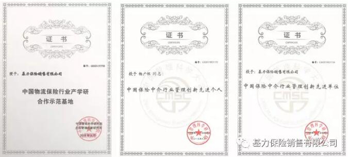 授予,基力保险销售有限公司中国保险中介管理创新先进单位。